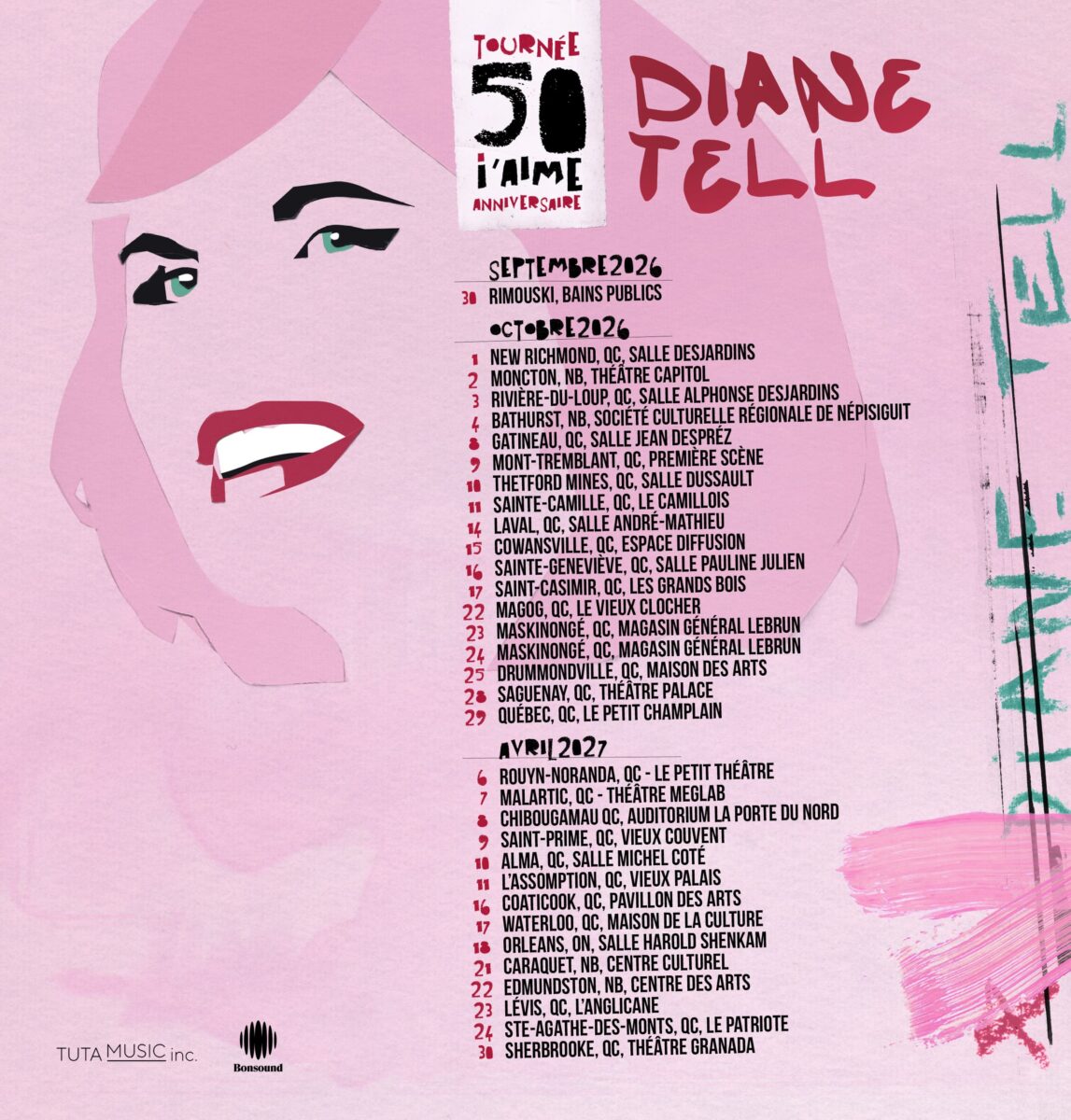 Diane Tell – Tournée 50 i’aime 2026/2027 – Coup d’envoi le 30 septembre 2026 aux Bains Publics de Rimouski